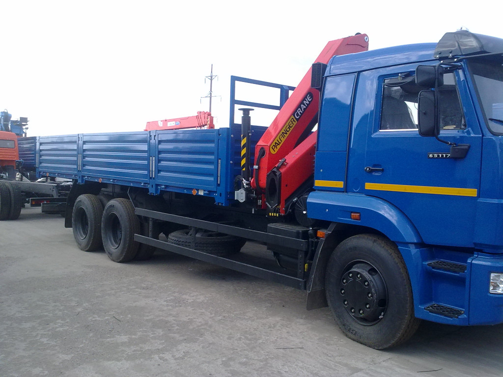 Самосвал КАМАЗ 65117 с КМУ Palfinger c платформой из бортовых панелей